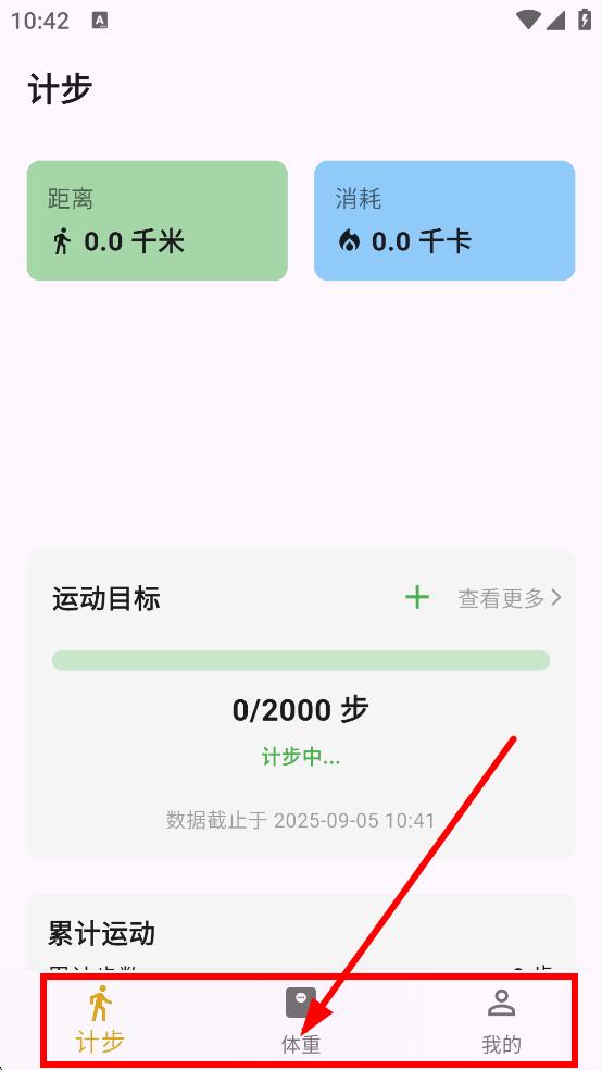 1、進入首頁,在計步頁面,點擊底部體重,進入體重頁面。