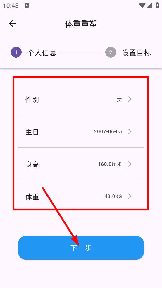 3、在個人信息頁面,填寫性別、生日、身高、體重等信息后,點擊下一步。