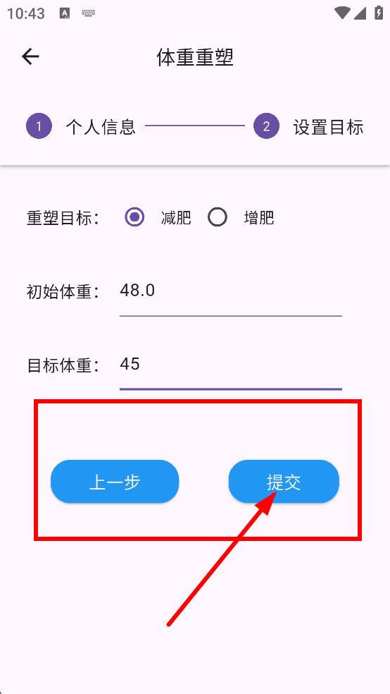 4、在設(shè)置目標頁面,選擇重塑目標,設(shè)置目標體重后,點擊提交,完成體重重塑目標設(shè)置。