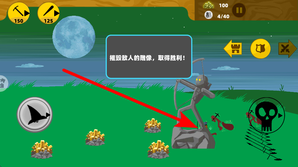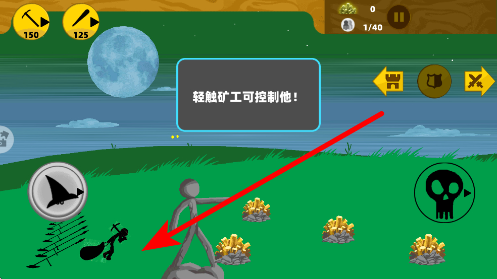 3、進(jìn)入戰(zhàn)斗后,能看到礦工等單位,按照提示輕觸礦工可對(duì)其進(jìn)行控制,指揮礦工挖礦獲取資源,這些資源可用于召喚更多戰(zhàn)斗單位或升級(jí)單位。
