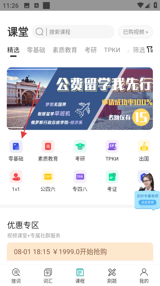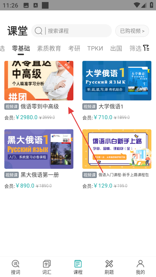 2、在零基礎(chǔ)課程頁(yè)面,選擇俄語(yǔ)零到中高級(jí)課程,進(jìn)入其詳情頁(yè)面。