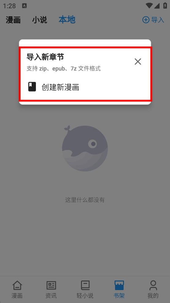 2、在書架頁面,點(diǎn)擊右上角導(dǎo)入,彈出導(dǎo)入新章節(jié)的提示框。