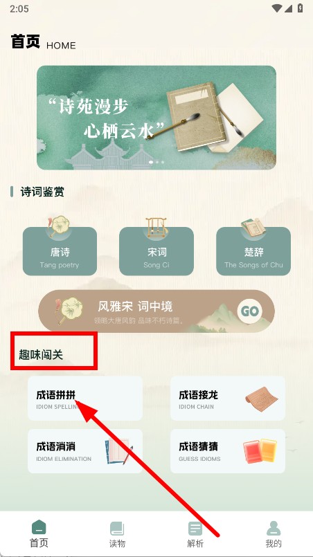 1、打開APP首頁,在趣味闖關區(qū)域,點擊成語拼拼。
