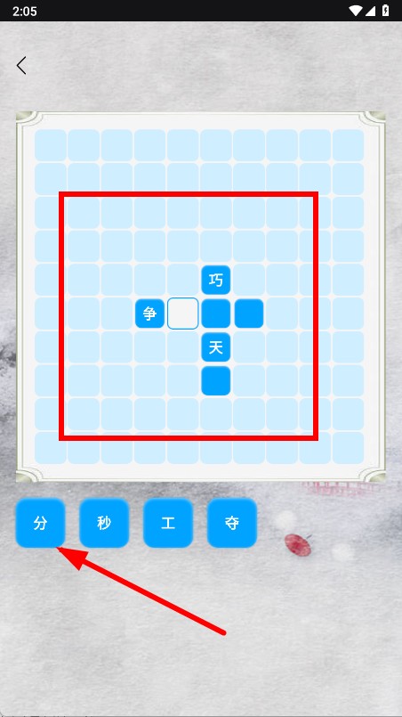 3、在關卡內(nèi),根據(jù)方格已有字,從下方選字填入空白處拼成語。