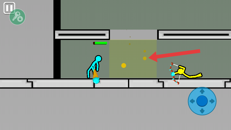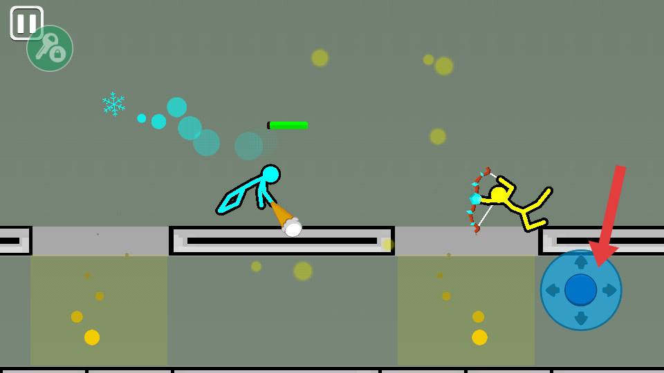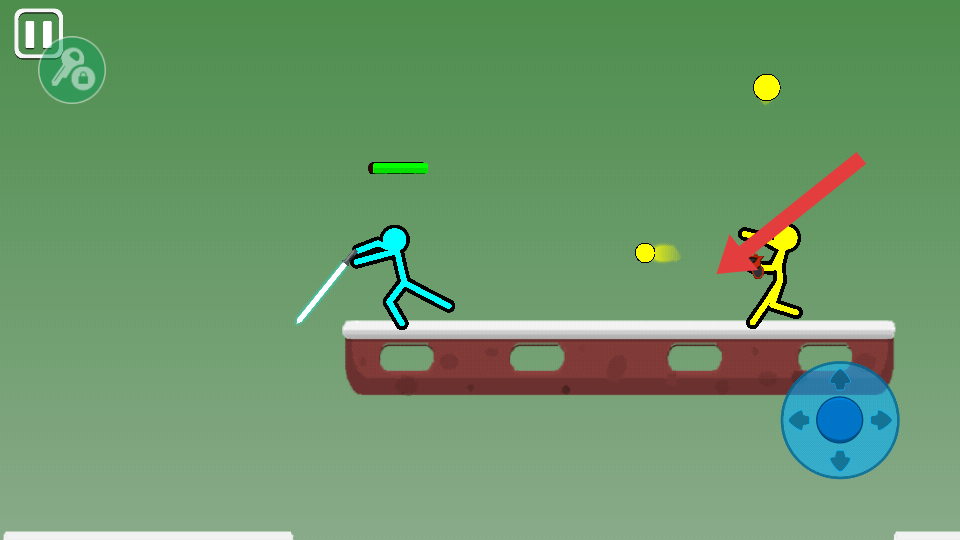 1、基礎(chǔ)對戰(zhàn)操作:通過長按或短按方向鍵控制火柴人移動(dòng)與攻擊方向,利用武器新手推薦回旋鏢打擊敵方,貼近用腿部進(jìn)行近身攻擊,頭部的傷害更高。