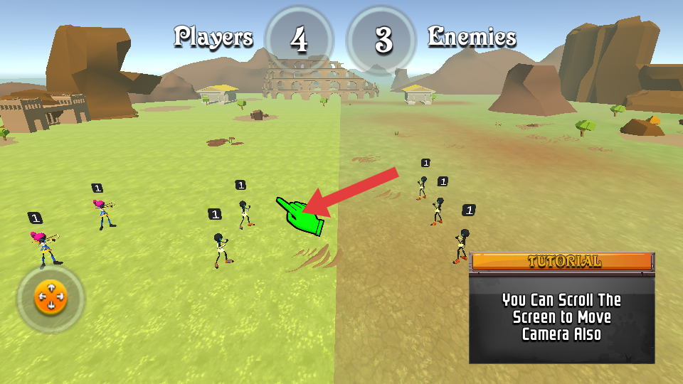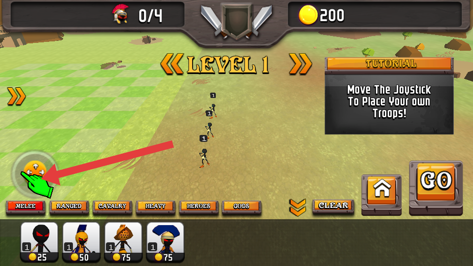 1、利用操縱桿,根據(jù)戰(zhàn)場情況和敵人位置,合理放置自己的火柴人部隊(duì),將不同類型部隊(duì)搭配布置,形成有序陣型。