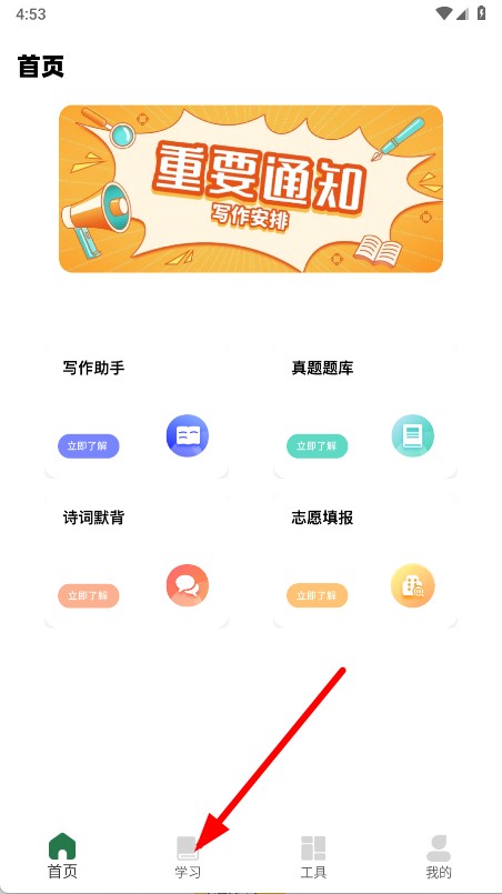 1、打開APP,點擊底部學(xué)習(xí),進入學(xué)習(xí)頁面。