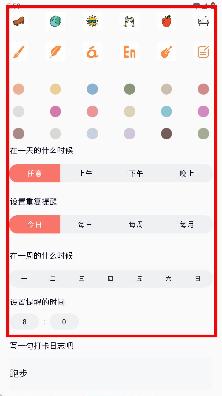 4、選擇圖標(biāo)、顏色,設(shè)置提醒時間等,完成運動打卡設(shè)置。