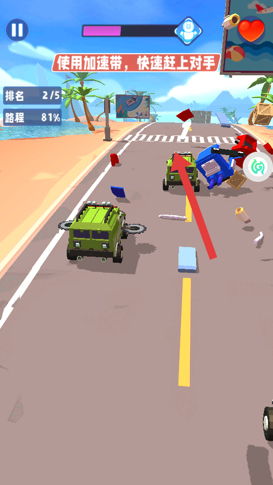 2、比賽過程中,當(dāng)角色靠近加速帶時,盡量駛?cè)爰铀賻^(qū)域,借助加速帶快速提升速度,縮小與對手的差距。