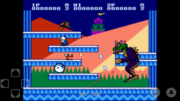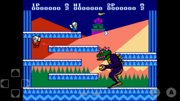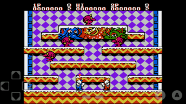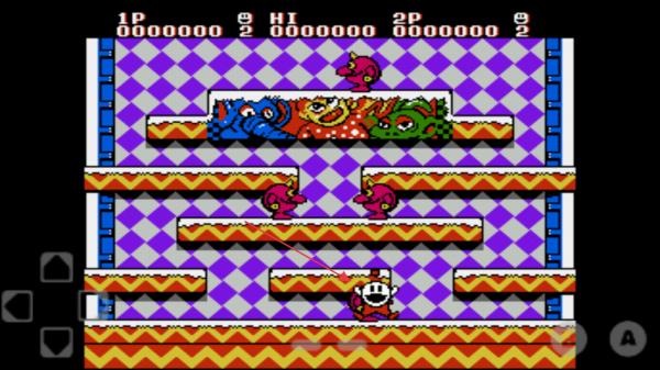 1、進入游戲,操控雪人角色移動,屏幕上方顯示信息,代表1P玩家分數(shù)和剩余生命數(shù)。