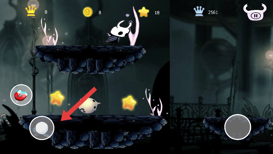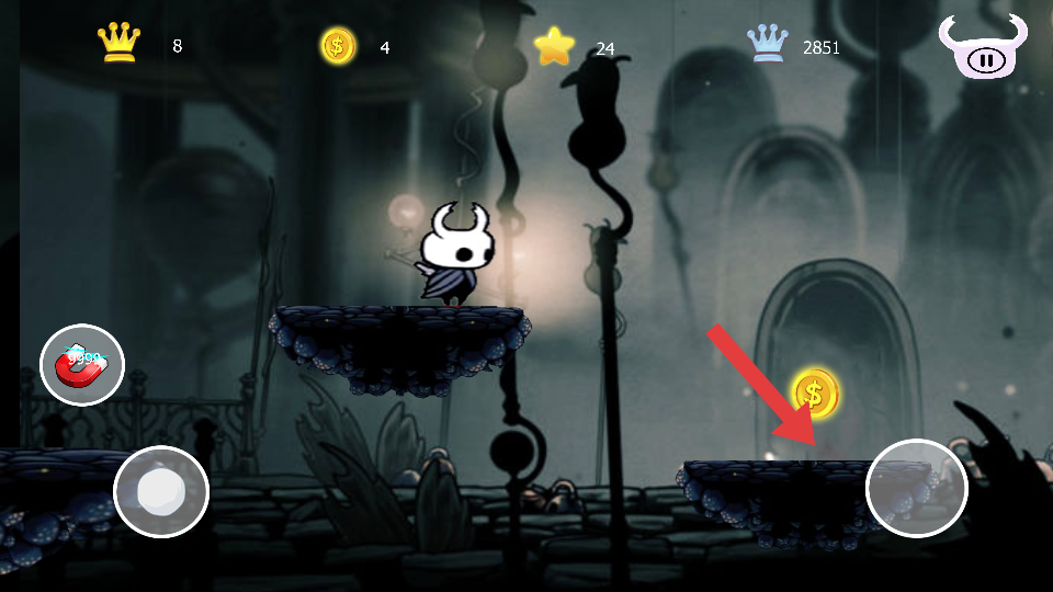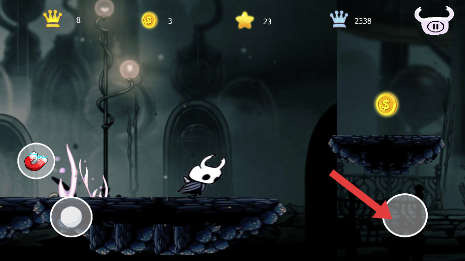 1、利用左下角虛擬按鍵操控角色移動(dòng),在平臺(tái)間靈活穿梭,注意觀察平臺(tái)分布,規(guī)劃移動(dòng)的路徑。
