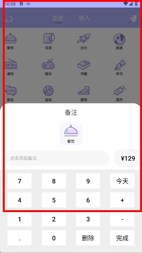 4、選擇支出或收入分類,填寫金額,也可添加備注,填寫完成后即可完成賬單記錄。