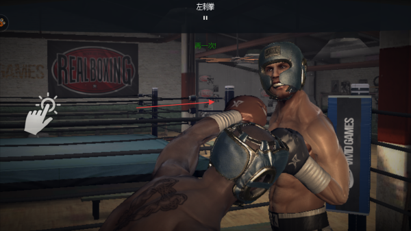 1、進(jìn)入游戲看到提示操控角色準(zhǔn)備出拳,留意界面上方顯示的左刺拳提示,點(diǎn)擊對(duì)應(yīng)位置出拳。