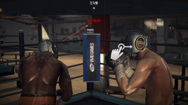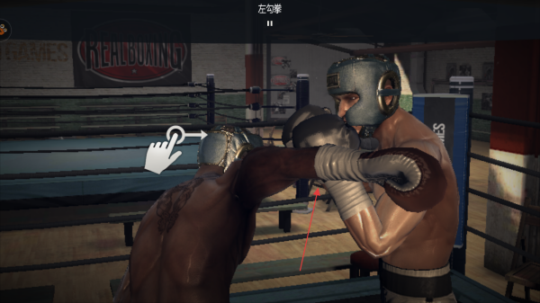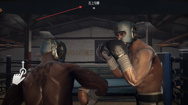 2、根據(jù)對(duì)手動(dòng)作和距離,選擇合適的拳擊動(dòng)作,如看到提示點(diǎn)擊屏幕做出左勾拳動(dòng)作攻擊對(duì)手。