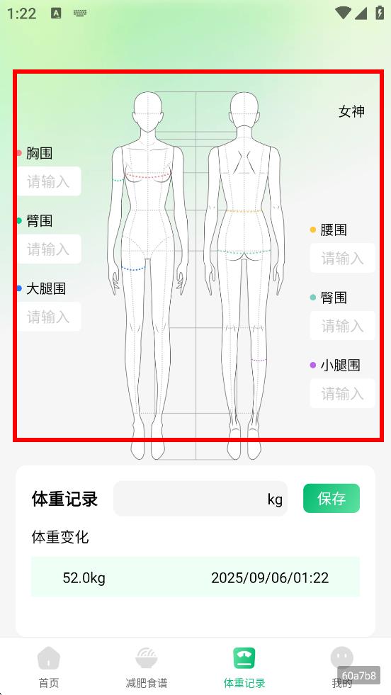 3、在體重記錄頁面,可輸入胸圍、臂圍等身體圍度信息。