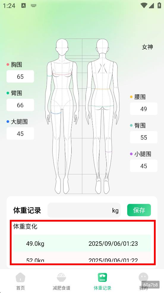 4、輸入身體圍度信息并保存后,可查看體重變化記錄。