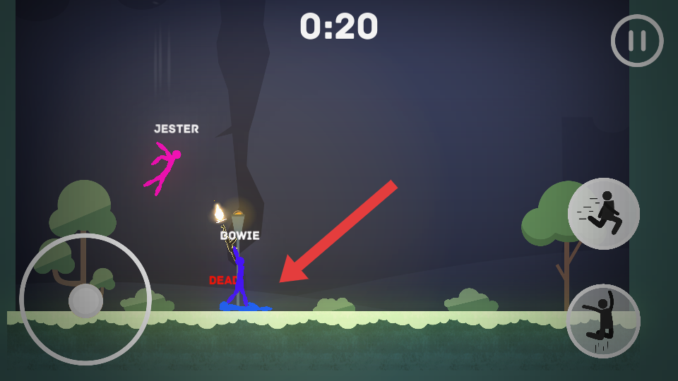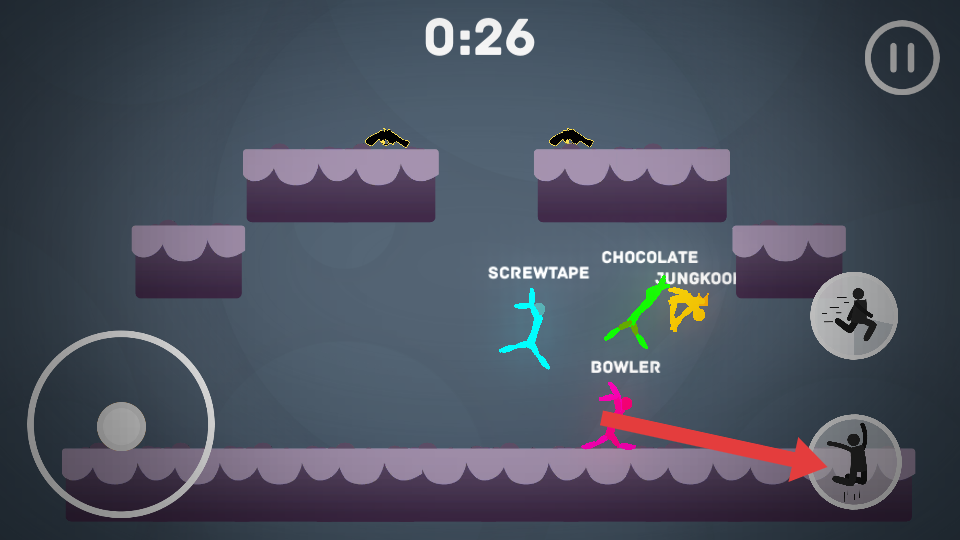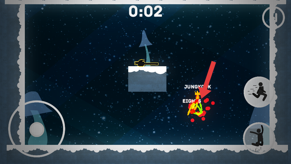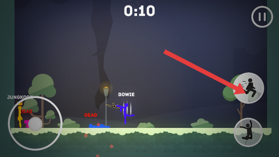 1、通過左側(cè)虛擬搖桿控制火柴人移動(dòng),發(fā)現(xiàn)敵方火柴人后,點(diǎn)擊右側(cè)奔跑按鈕提升移速,快速貼近敵人,為進(jìn)攻創(chuàng)造條件。