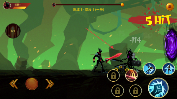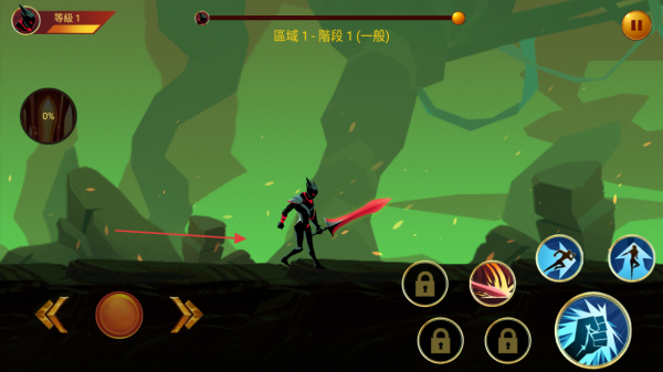 1、進(jìn)入游戲查看左上角等級1和區(qū)域階段信息,操控暗影戰(zhàn)士移動探索區(qū)域。