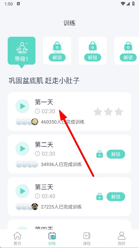 2、在訓練頁面,選擇第一天訓練內(nèi)容并點擊。