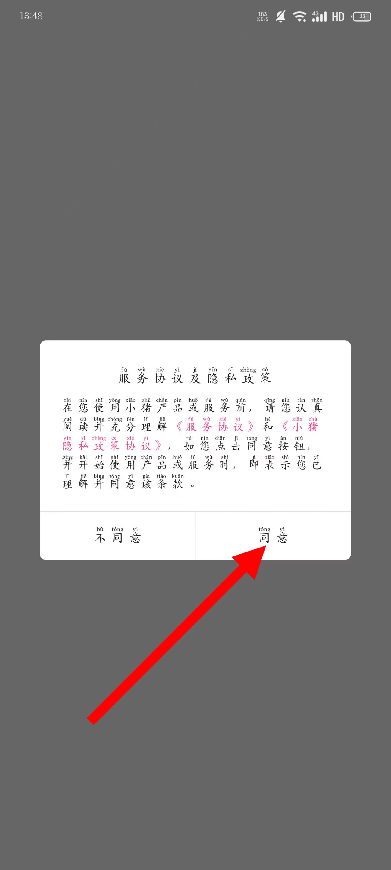1、打開(kāi)小豬民宿APP,在彈出的頁(yè)面點(diǎn)擊同意。