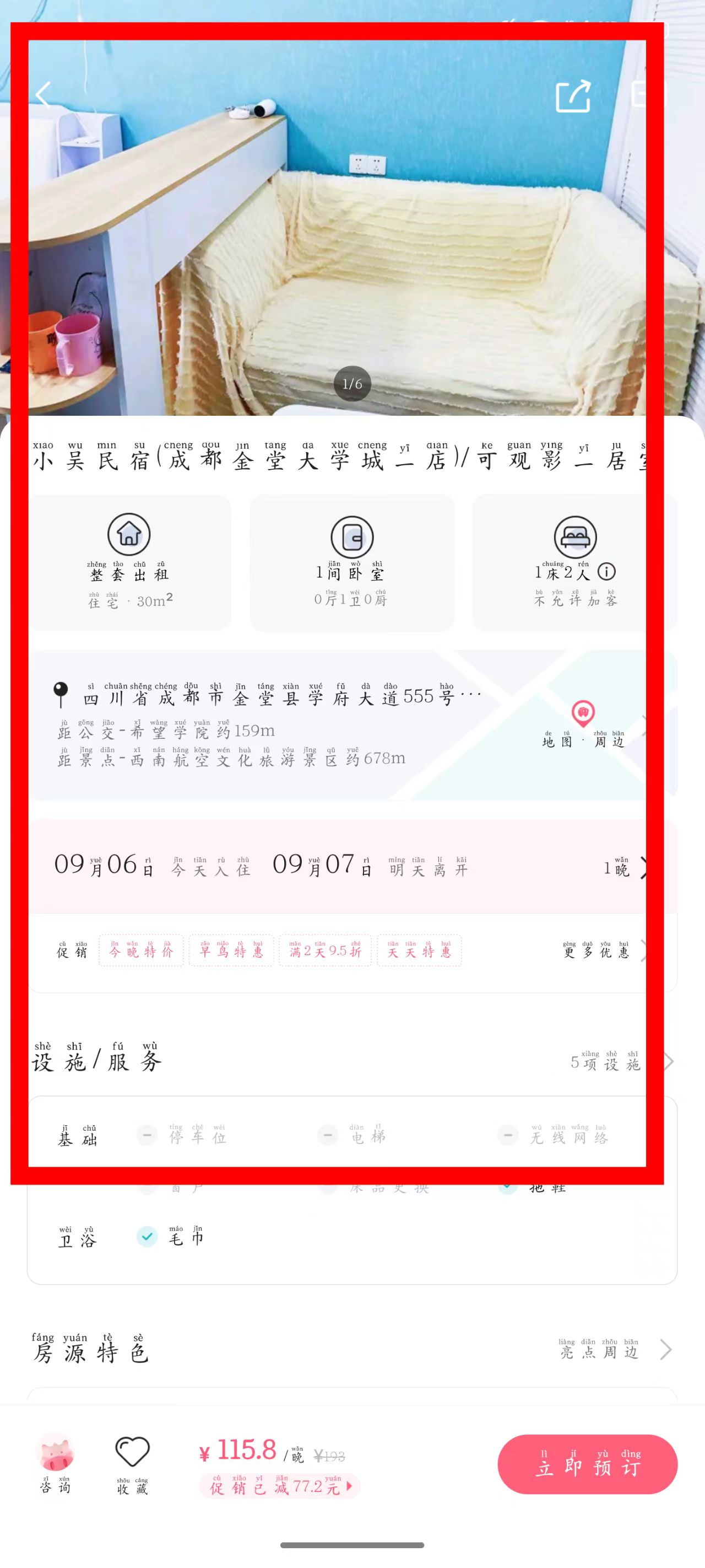 4、進(jìn)入詳情頁(yè)面后,查看民宿的圖片、戶(hù)型、位置、設(shè)施服務(wù)等信息。