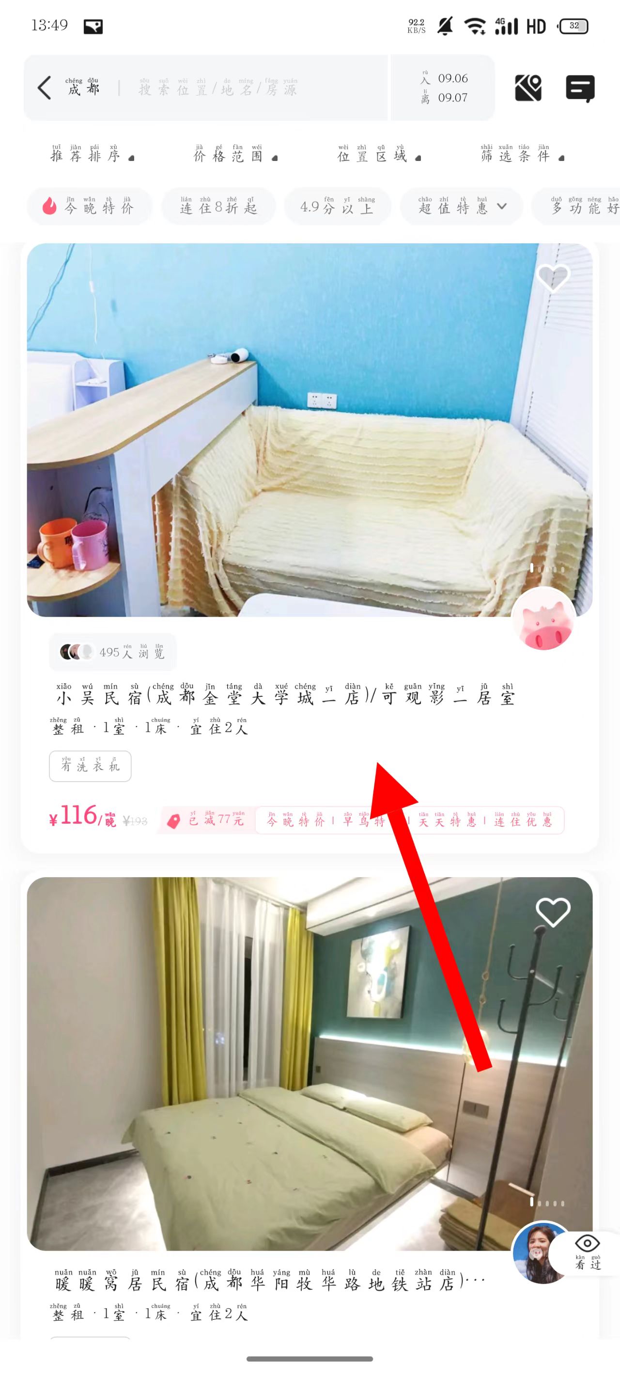 3、在搜索結(jié)果頁(yè)面,點(diǎn)擊想要查看的民宿。