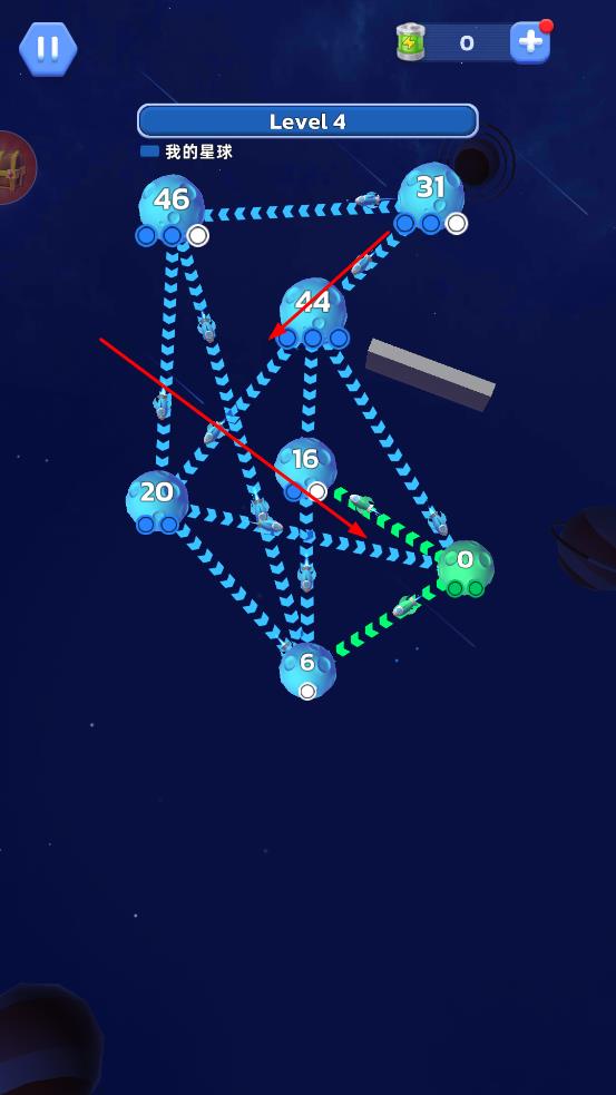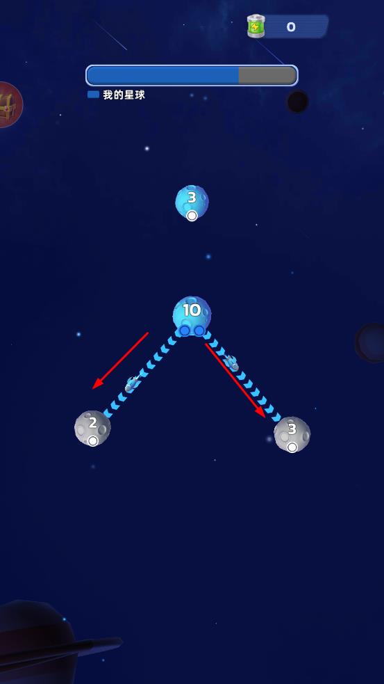 1、初始階段,操控我的星球向周圍帶有數(shù)值的星球發(fā)射輸送線,占領低數(shù)值星球,積累資源,為后續(xù)擴張奠定基礎。