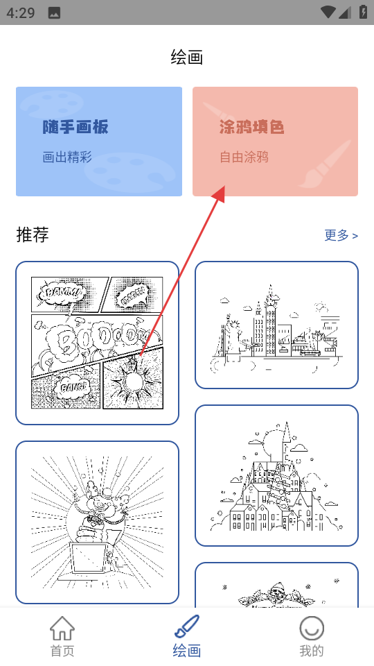 2、在繪畫頁面,點擊涂鴉填色,進入填色圖案選擇頁面。