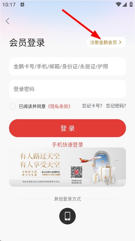 3、在登錄注冊頁面,點擊注冊金鵬會員,進入會員注冊流程。