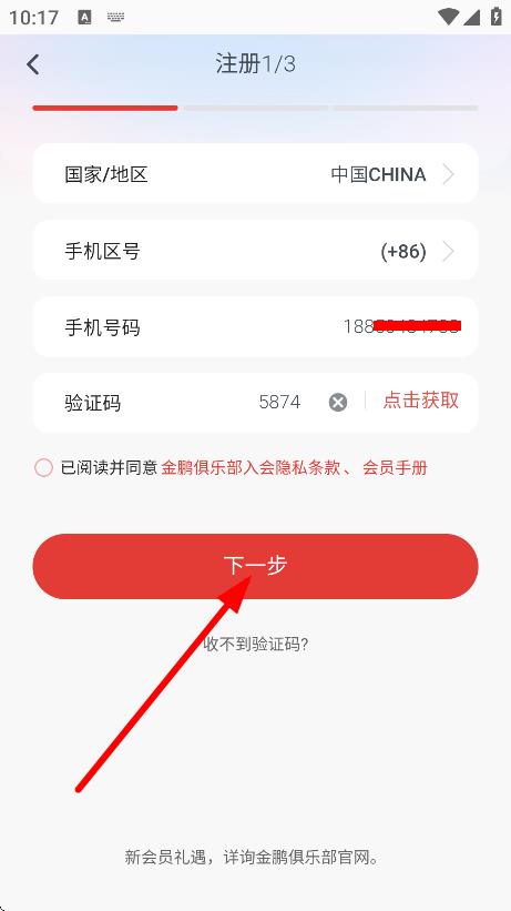 4、在注冊頁面,填寫手機號、驗證碼等信息,勾選同意條款后,點擊下一步,繼續(xù)注冊。