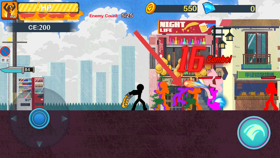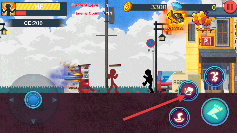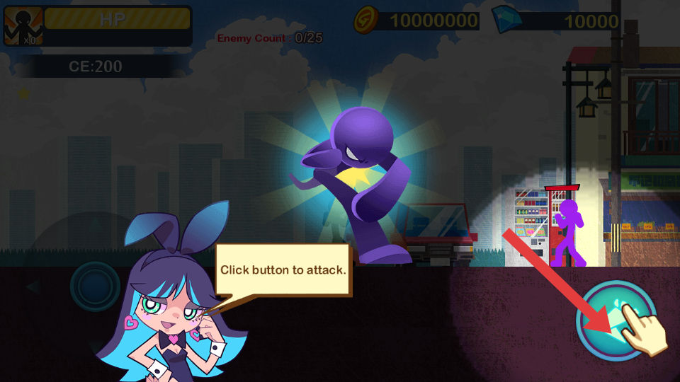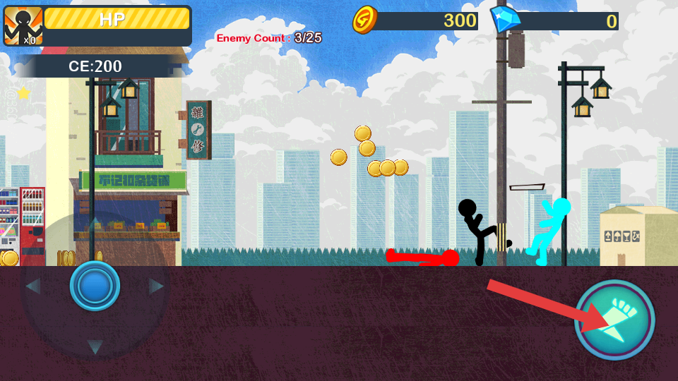 1、通過(guò)方向鍵控制火柴人移動(dòng),配合右下角攻擊按鍵練習(xí)基礎(chǔ)打擊操作,初期優(yōu)先攻擊單個(gè)的敵人。
