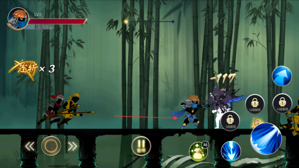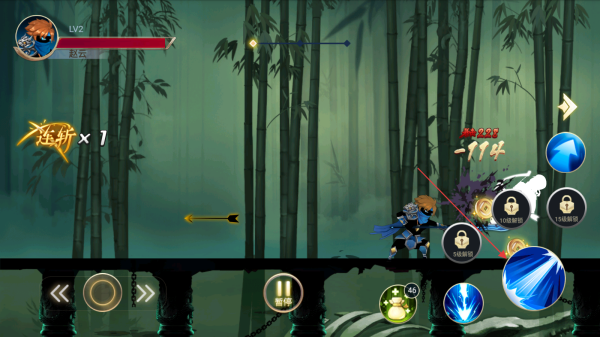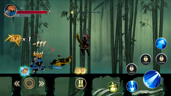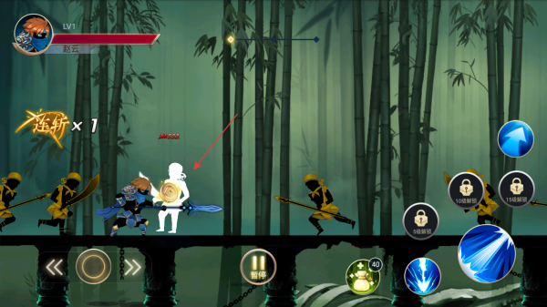 1、操控趙云進(jìn)入竹林關(guān)卡,留意自身Lv1等級和血量條,利用普攻按鈕攻擊前方白色敵人。