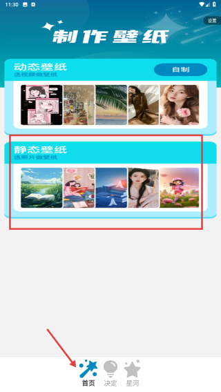 1、打開壁紙應(yīng)用,進(jìn)入首頁,可瀏覽動態(tài)壁紙和靜態(tài)壁紙分類下的各類壁紙。