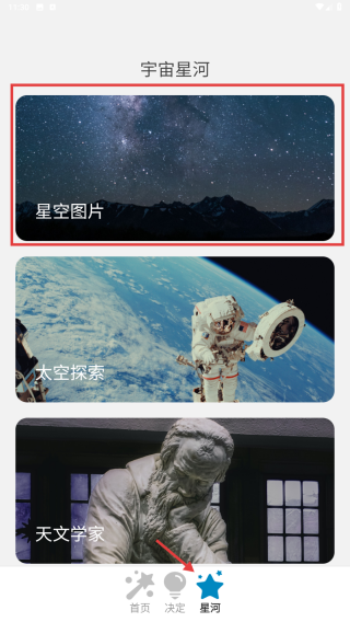 3、點(diǎn)擊底部星河選項(xiàng),進(jìn)入宇宙星河頁面,選擇星空圖片分類。