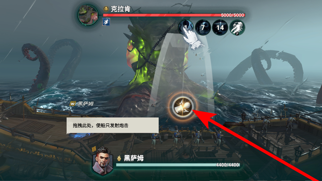 1、首先要指揮射擊,在遭遇敵人如克拉肯時,按照提示拖拽相應位置,使船只發(fā)射炮擊,以此對敵人造成傷害,開啟戰(zhàn)斗環(huán)節(jié),應對航海中的威脅。