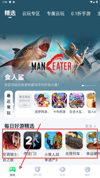 1、打開APP,進入游戲頁面,可瀏覽精選、云玩專區(qū)、專屬云玩、0.1折手游等分類,查看每日好游精選里的游戲。