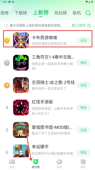 2、點擊底部排行榜選項,進入排行榜頁面,選擇上新榜,查看新近上線的熱門游戲,如卡布西游微端等。