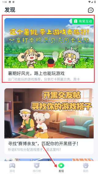 3、點擊底部發(fā)現(xiàn)選項,進入發(fā)現(xiàn)頁面,參與“這個暑假,帶上游戲去旅行!”分享打卡活動,贏取獎勵。