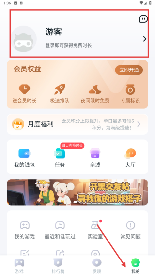 4、點擊底部我的選項,進入個人中心頁面,可看到游客狀態(tài)提示,登錄后可獲得免費時長,還能查看會員權(quán)益、月度福利等內(nèi)容。