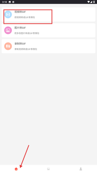 1、打開GIF制作類APP,進入首頁,可選擇視頻轉(zhuǎn)GIF、圖片轉(zhuǎn)GIF、錄制轉(zhuǎn)GIF等功能,進行GIF制作。