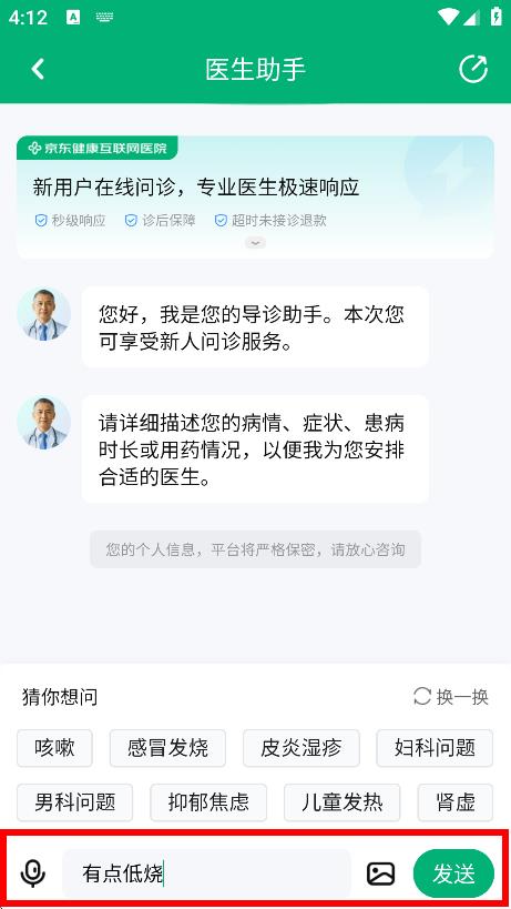 2、在助手頁面,輸入病情描述,點擊發(fā)送,與導診助手交流。