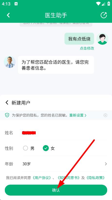 3、根據(jù)提示完善患者信息后,點擊確認,提交信息。
