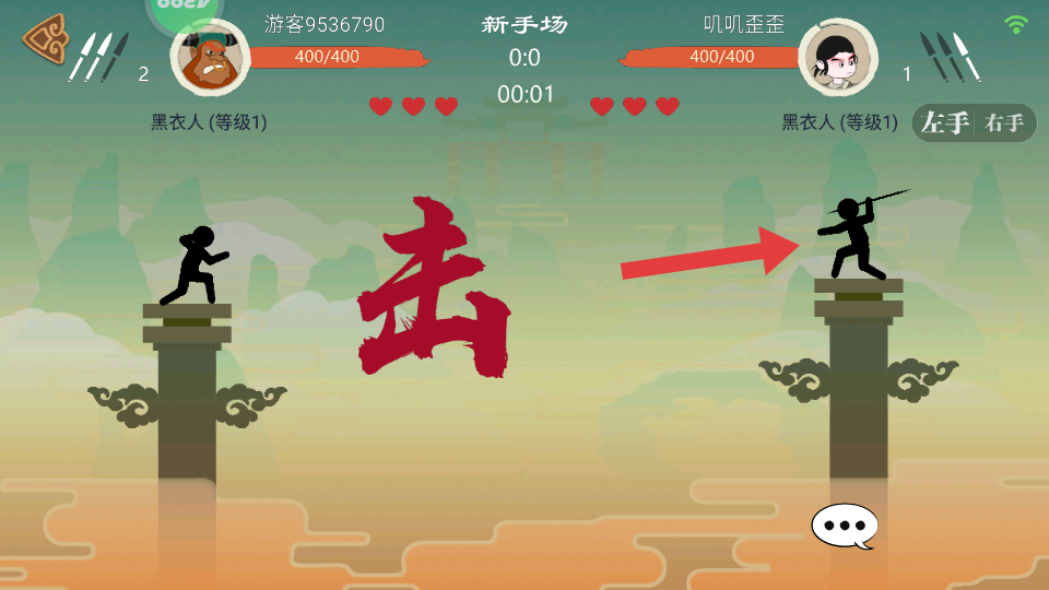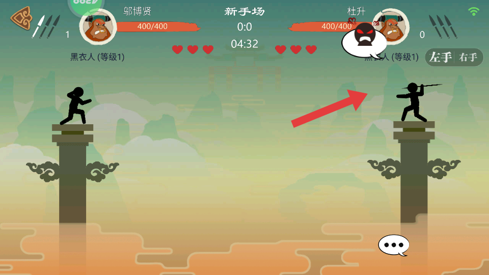 1、進(jìn)入古風(fēng)對(duì)戰(zhàn)場景后,先熟悉火柴人角色的基礎(chǔ)操控,通過方向鍵控制角色在石柱上移動(dòng),練習(xí)短按跳躍調(diào)整站位。