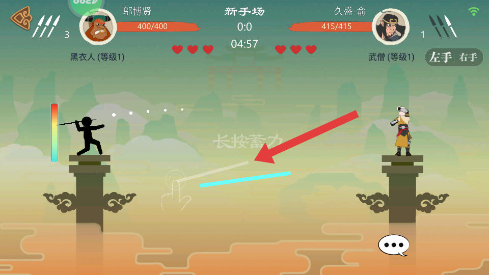 2、對戰(zhàn)黑衣人時,其攻擊速度快但傷害較低,可采用普攻+小蓄力組合,邊打邊退保持安全距離,面對武僧這類高防御敵人。