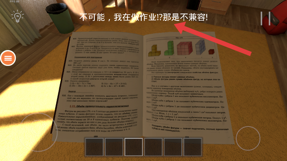 1、進(jìn)入寫(xiě)實(shí)房間場(chǎng)景后,先明確解謎核心方向,圍繞不可能,我在做作業(yè)?!那是不兼容!的文字提示展開(kāi)探索。