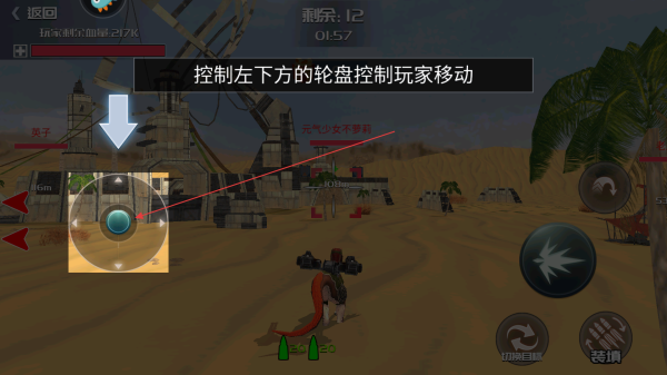 1、進入游戲,通過左下方的虛擬輪盤控制玩家移動,在場景中靈活走位。