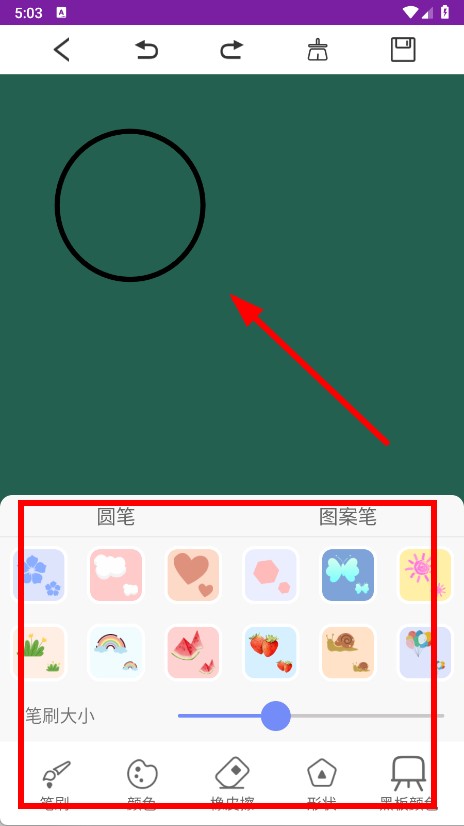 3、點擊筆刷,挑選筆刷樣式,調(diào)節(jié)筆刷大小后,在黑板畫布上繪制圖案。
