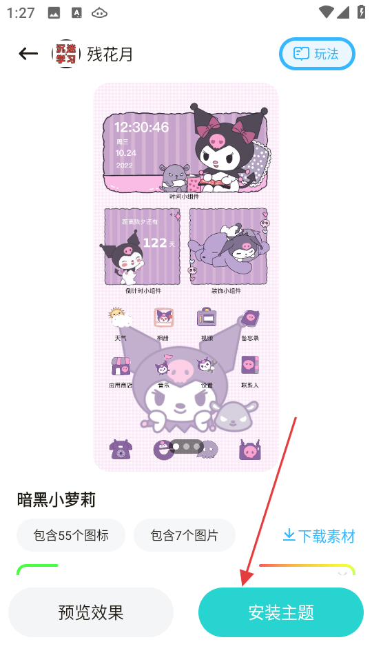 2、進(jìn)入主題詳情頁(yè)后,點(diǎn)擊安裝主題按鈕,觸發(fā)后續(xù)操作。