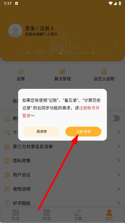 3、彈出提示框后,點(diǎn)擊選擇注冊和登錄按鈕。