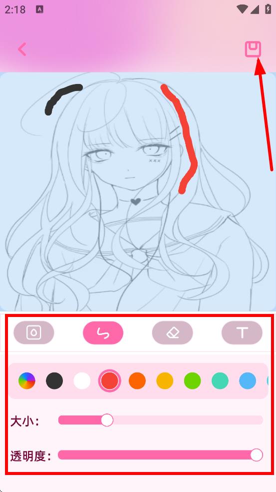 4、繪畫時,可使用下方工具調(diào)整畫筆顏色、大小、透明度等,畫完后點(diǎn)擊保存按鈕保存作品。